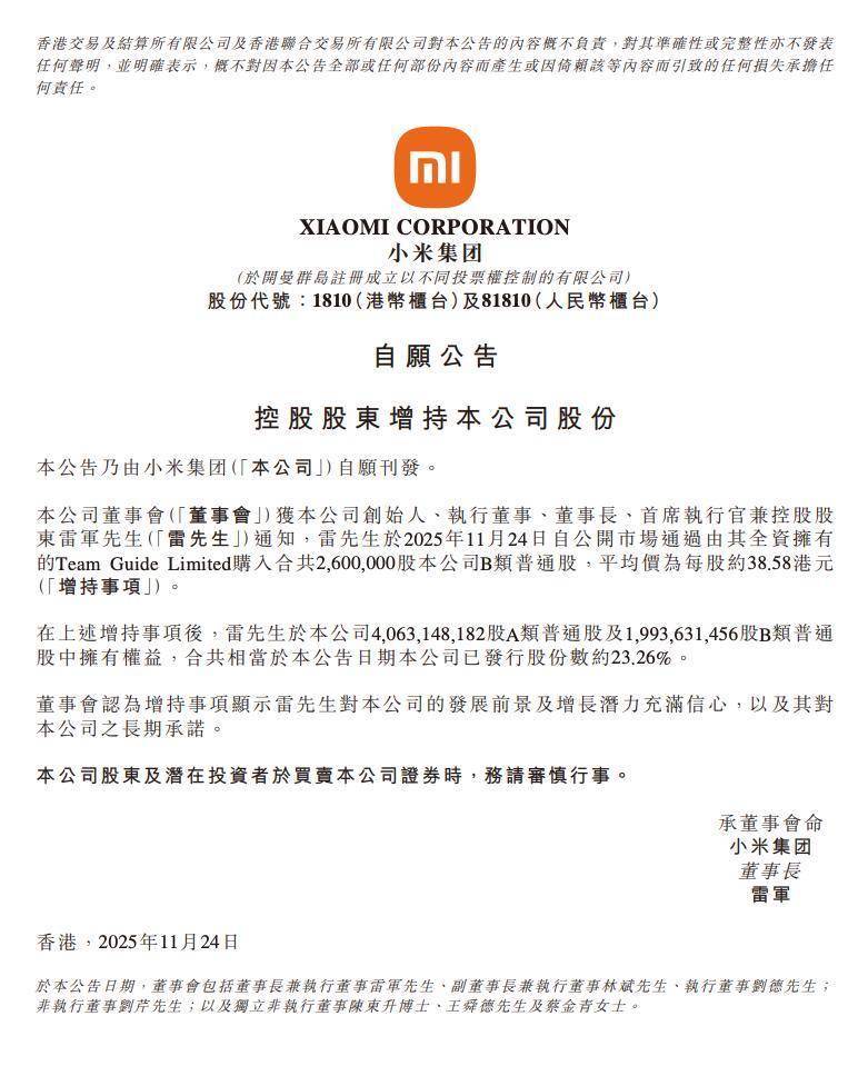小米集团董事会认为,增持事项显示雷军对公司的发展前景及增长潜力充满信心。
